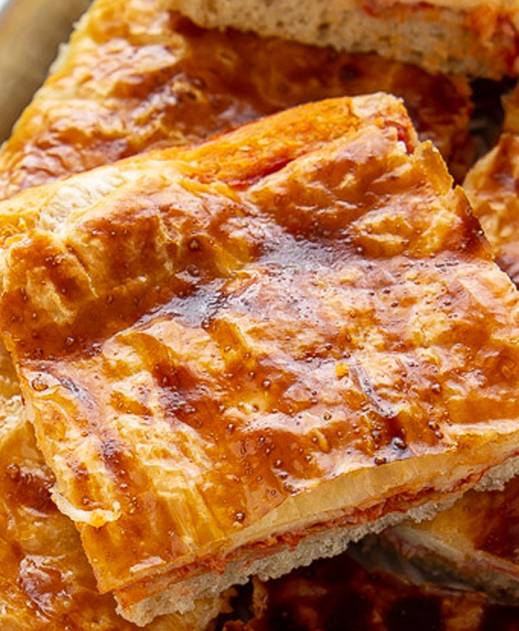 - В это время вы раскатываете слоеное тесто, чтобы придать ему размер противня, накрыть начинку, плотно запечатав края. Сделайте несколько проколов вилкой. Аккуратно смажте «крышечку» смесью из молока и желтка.