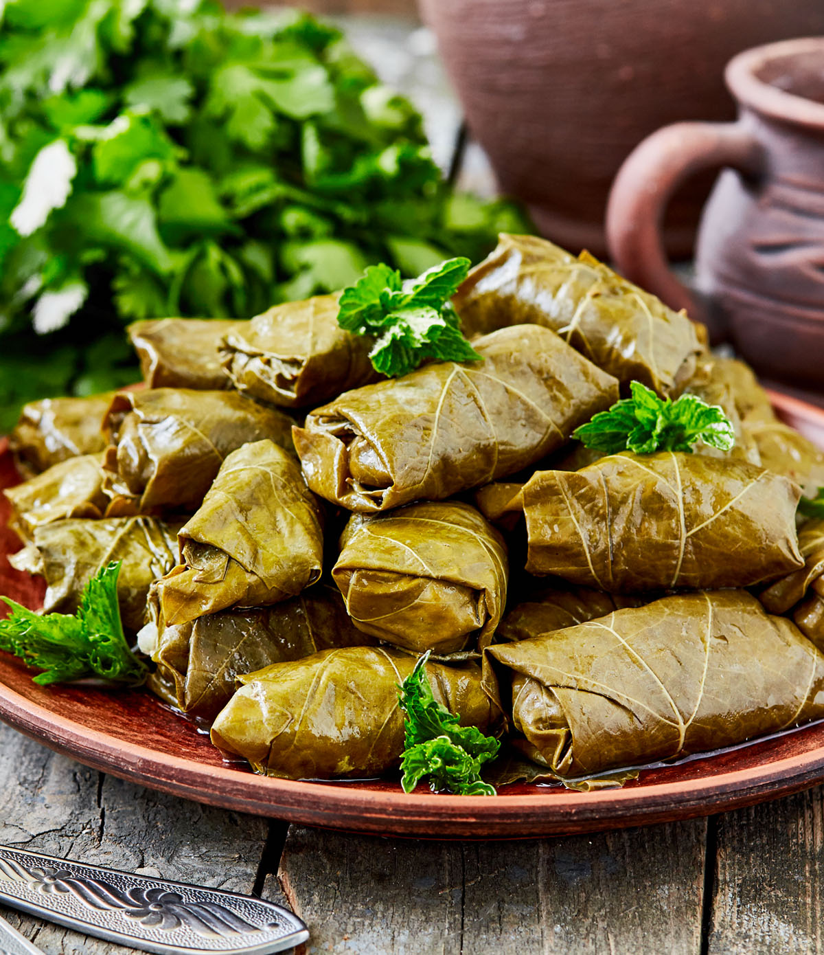 - Выкладываем на край виноградного листа 1-2 ч.л. фарша и заворачиваем. Повторяем процесс до тех пор, пока не закончатся листья и фарш.