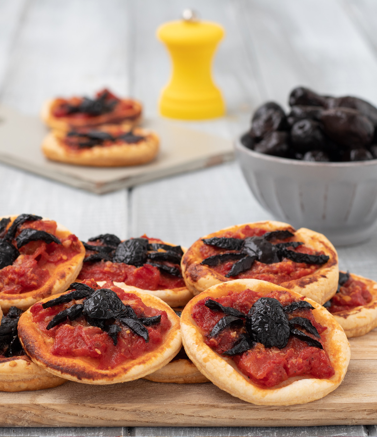 - Выложить паучков из оливок и готовить пиццы в предварительно разогретой духовке до 180 градусов в течение 20-25 минут, они должны быть золотистого цвета.