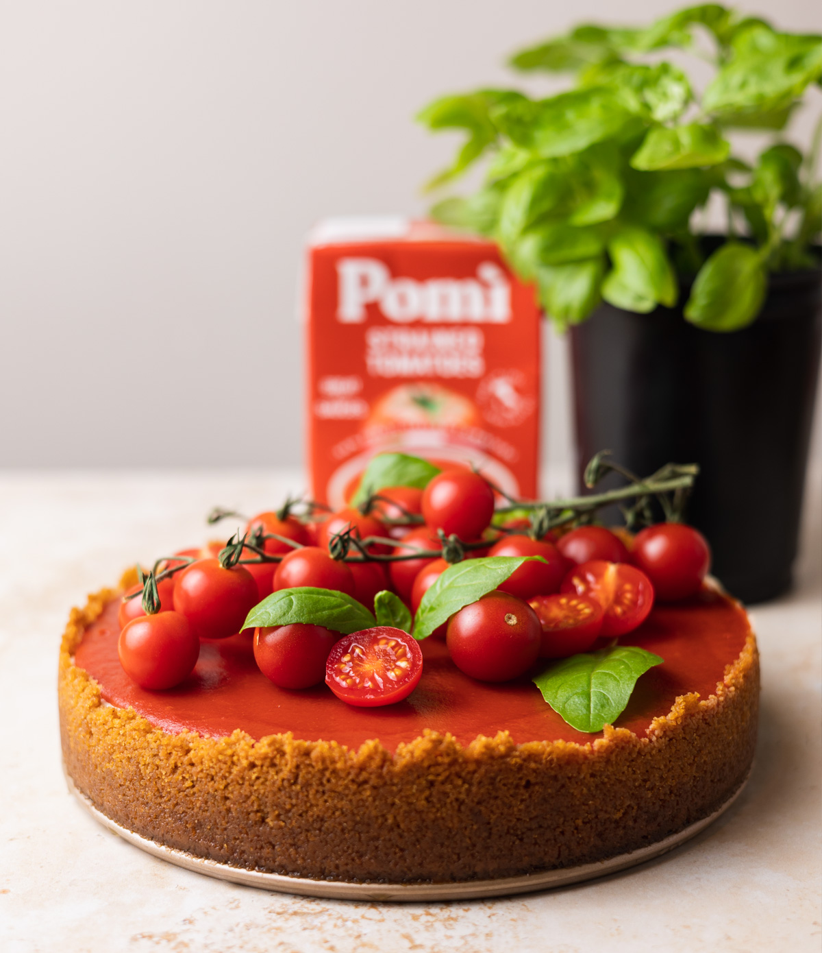 - Retirar cuidadosamente la tarta de queso del molde desmontable. Decorar con tomates cherry y hojas frescas de albahaca, servir ¡y a disfrutar!