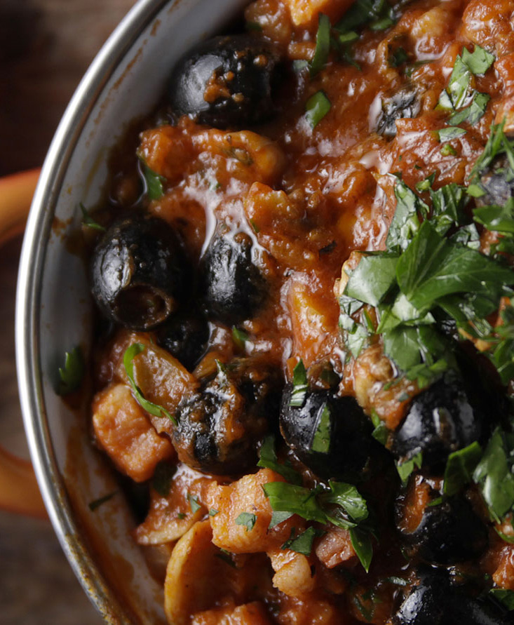 Unir la Tomate finamente troceado, mezclar bien los ingredientes y salpimentar. Por último, añadir el tomillo finamente picado junto con las aceitunas y cocer todo otros 5 minutos.