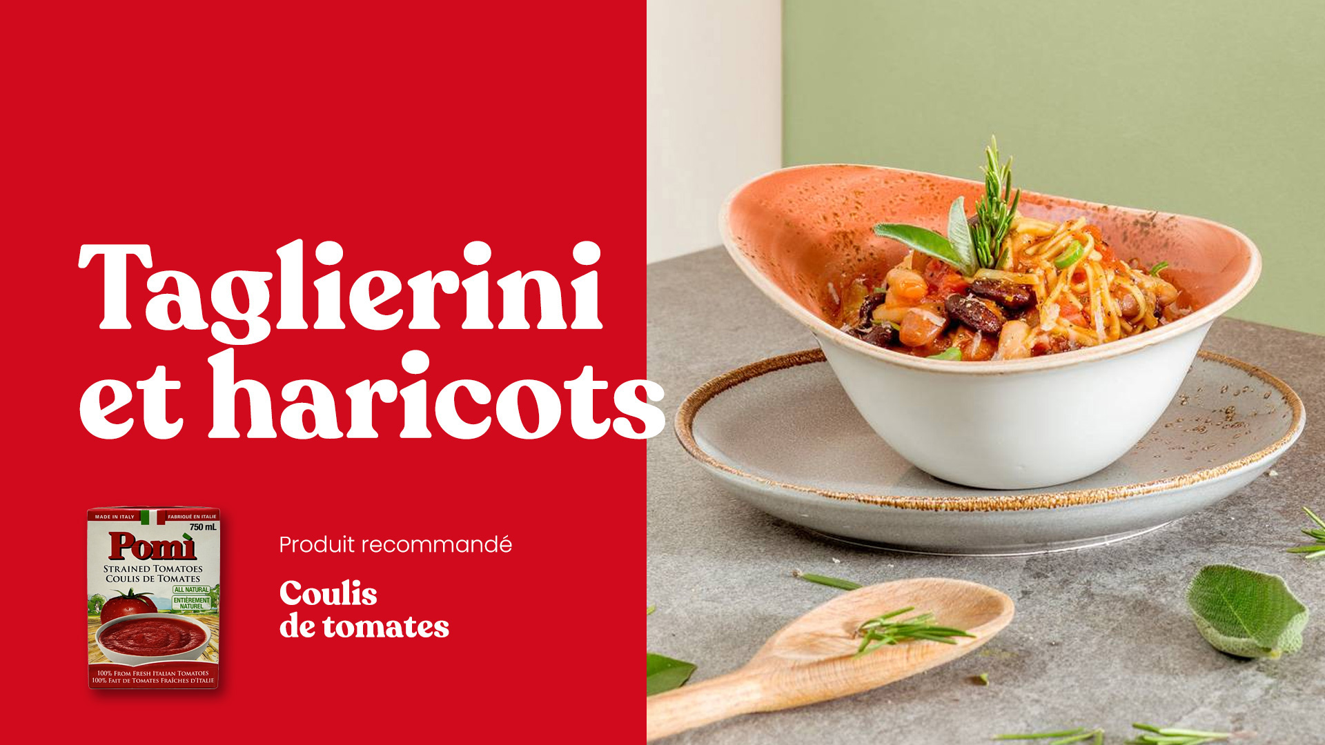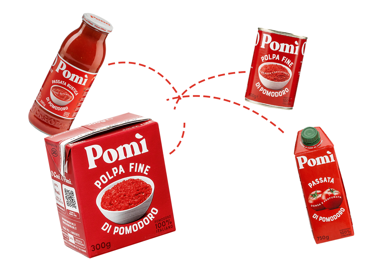 La purée de tomates, la pulpe et tous les autres produits Pomì apportent à la table toute l'authenticité des vraies tomates italiennes. Savoureux, naturels, riches en goût et adaptés à mille recettes, les produits Pomì offrent à tous les amateurs de bonne cuisine la possibilité de préparer des plats simples, authentiques et appétissants, tout en se prêtant à des recettes internationales plus élaborées à base de tomates. Dans la cuisine, le choix de chaque produit est un geste d'amour réservé aux personnes avec lesquelles on aime partager une émotion. Depuis 1982, Pomì met la même passion à récolter les meilleures tomates italiennes, cultivées et sélectionnées par plus de 800 exploitations, dans le respect de l'environnement et de la santé des consommateurs.