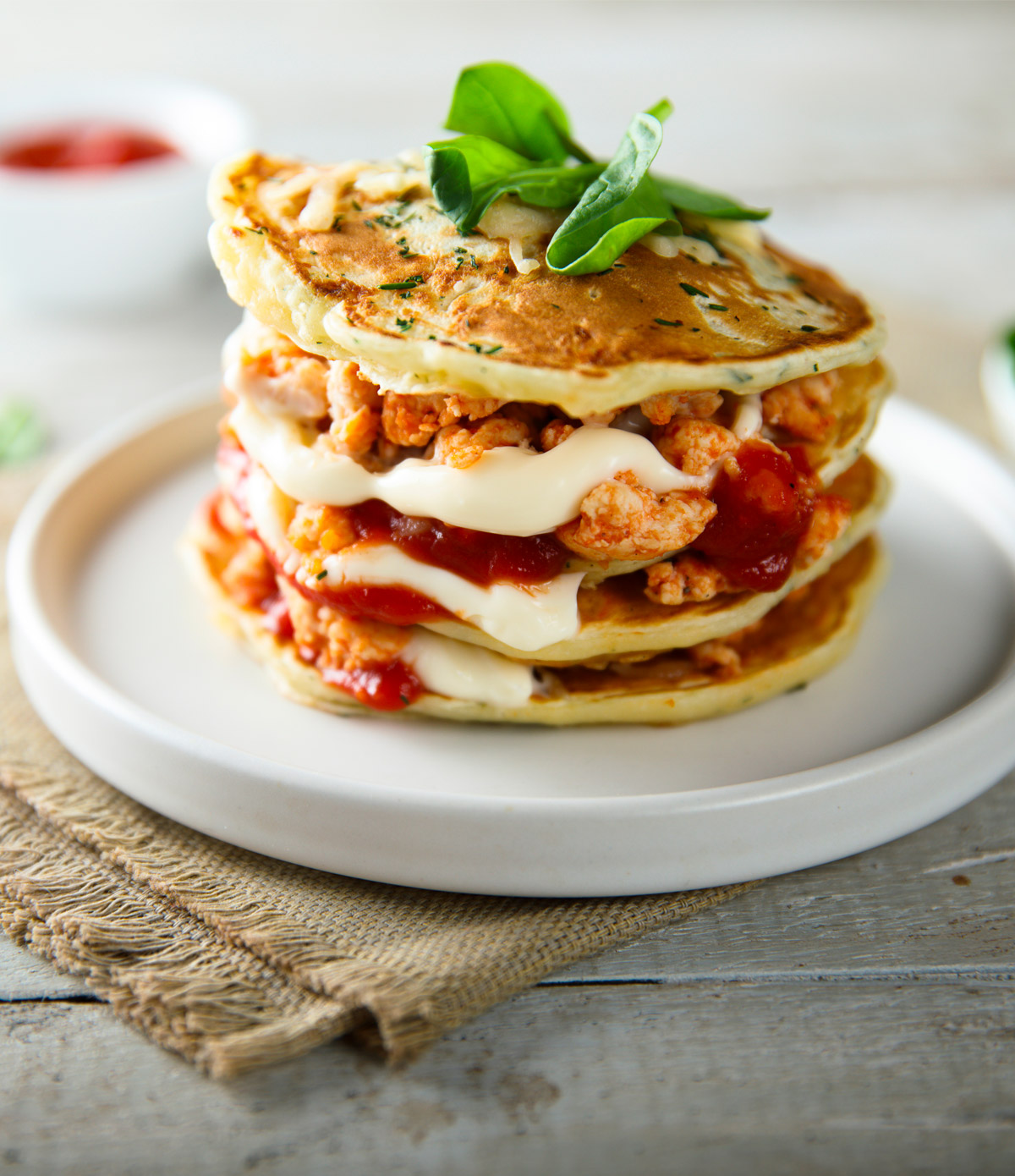 מסיימים את הרכבת המנה עם לביבת פנקייק מלמעלה. מפזרים את 25 גרם הפרמזן המגורד הנותרים.