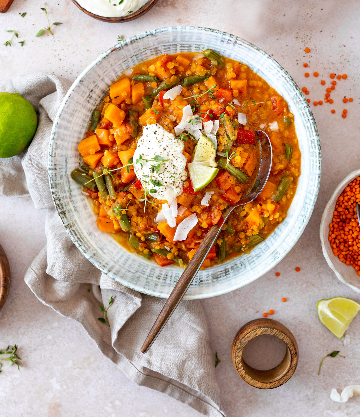 - מחממים שמן זית בסיר רחב ומטגנים בצל ושום עד לשקיפות. מוסיפים רסק עגבניות, קוביות בטטה ועדשים ומטגנים 3-4 דקות.