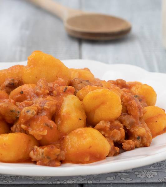 Sugo salsiccia e pancetta, per un primo davvero delizioso! Se poi lo abbinate agli gnocchi di patate, la conquista di ogni palato è assicurata!
