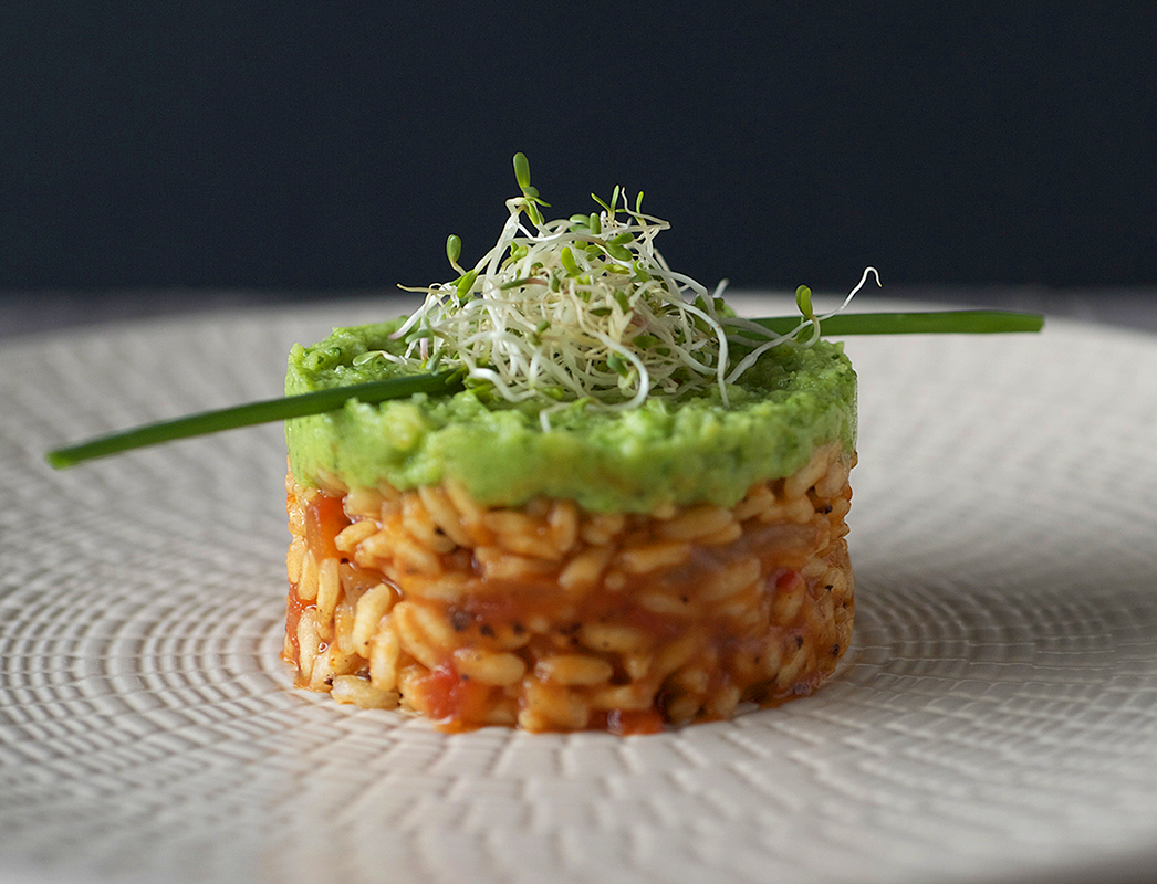 Risotto al pomodoro, ceci, prezzemolo e spuma di broccoli