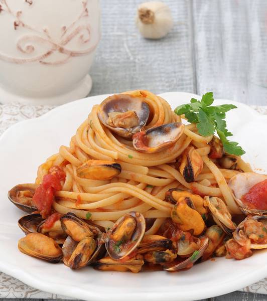 - In una padella soffriggete l'aglio con 4 cucchiai di olio d'oliva, poi eliminate l'aglio, versate i pomodori a cubetti Pomì, salate, pepate e aggiungete qualche foglia di basilico.