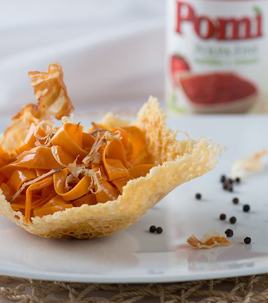 - Una volta tirato il sugo, sfumare con vino bianco e aggiungere la Polpa Fine Pomì.