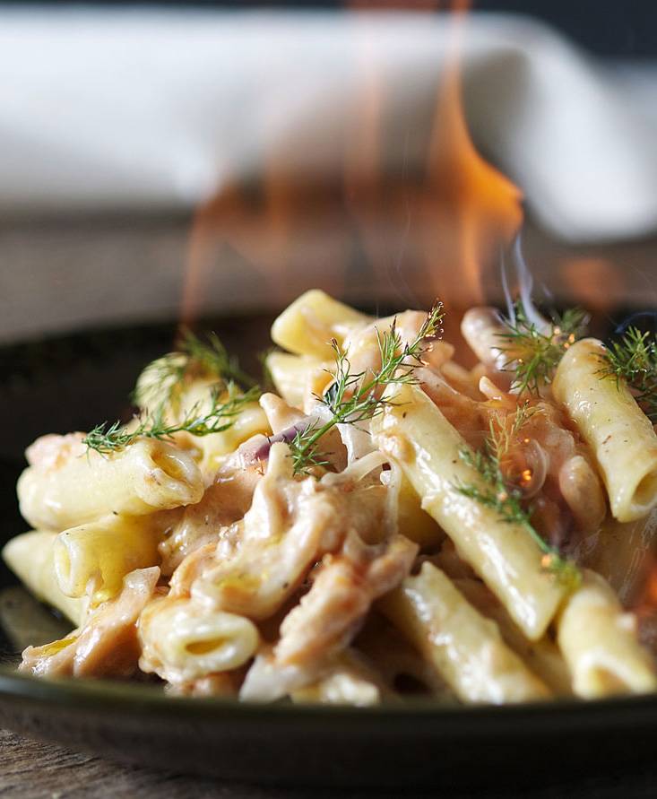 - Sfumare con la vodka e, prima che sfumi del tutto, con l’aiuto di un accendino flambare la vodka nella padella.