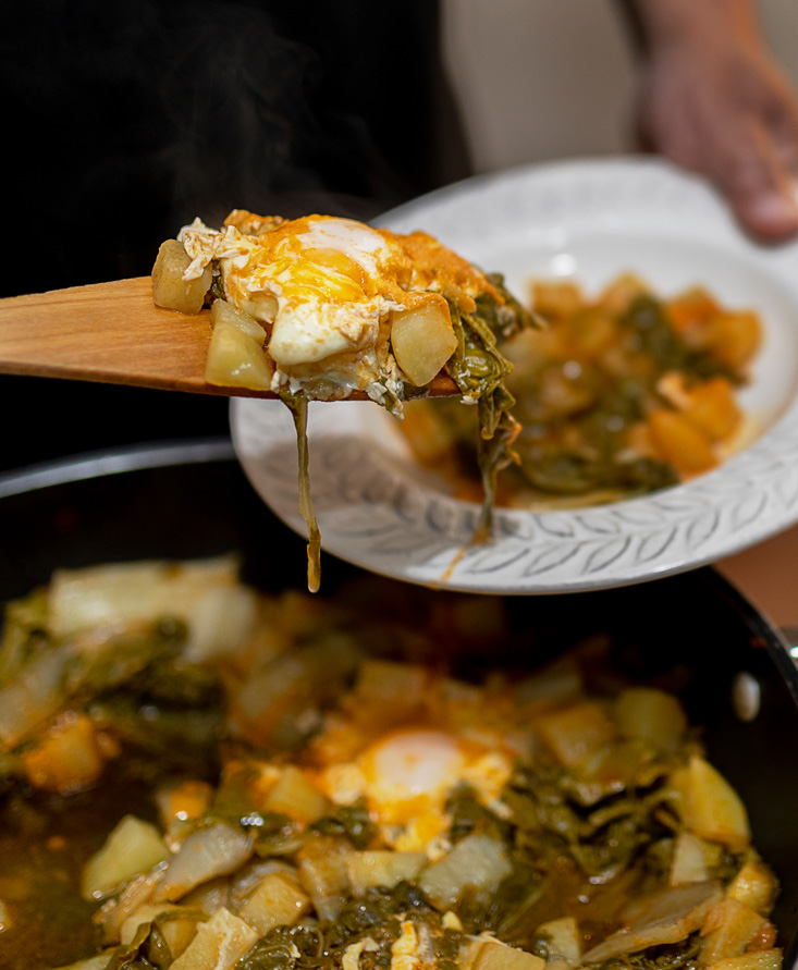 - Tagliare il pane a cubetti facendo fette da un centimetro, trasferire l’acquacotta in una ciotola di terracotta lasciando il sugo abbastanza brodoso in modo che possa inzuppare i cubetti di pane che verranno posti in superficie insieme a una spolverata di pecorino.