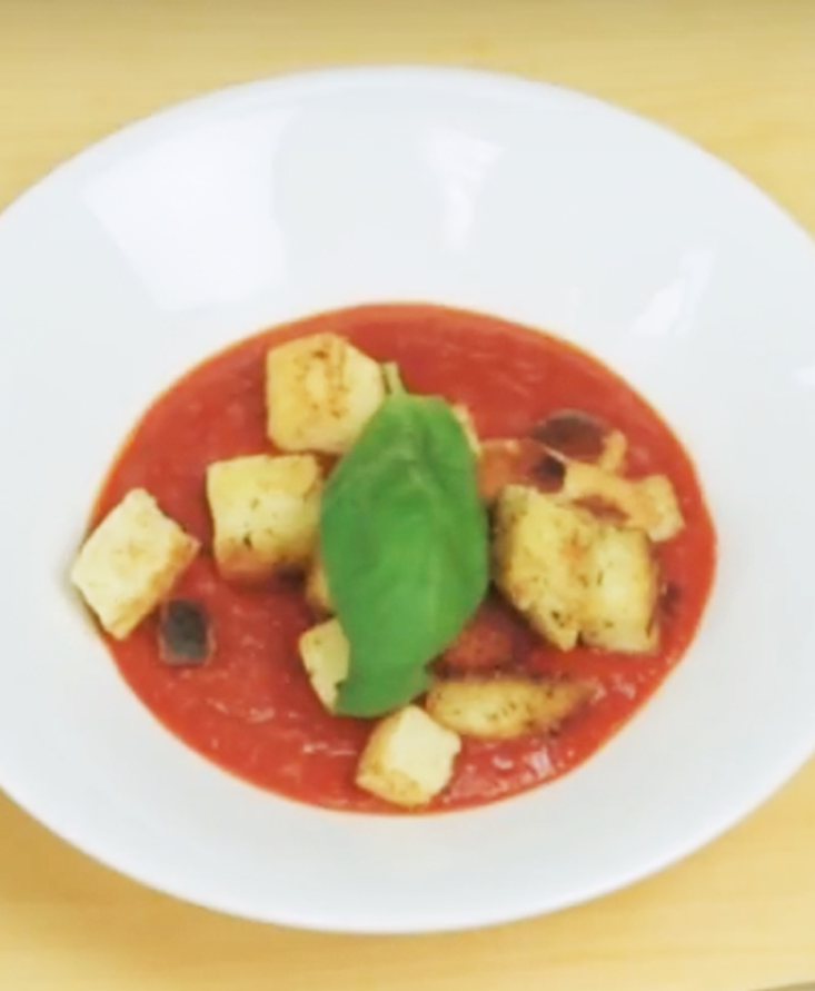Tagliamo a parte del pane a dadini e saltiamolo in padella con un filo di olio, insaporendolo con origano abbondante, sale e pepe. Impiattiamo la crema in un piatto fondo e adagiamo sopra i crostini.