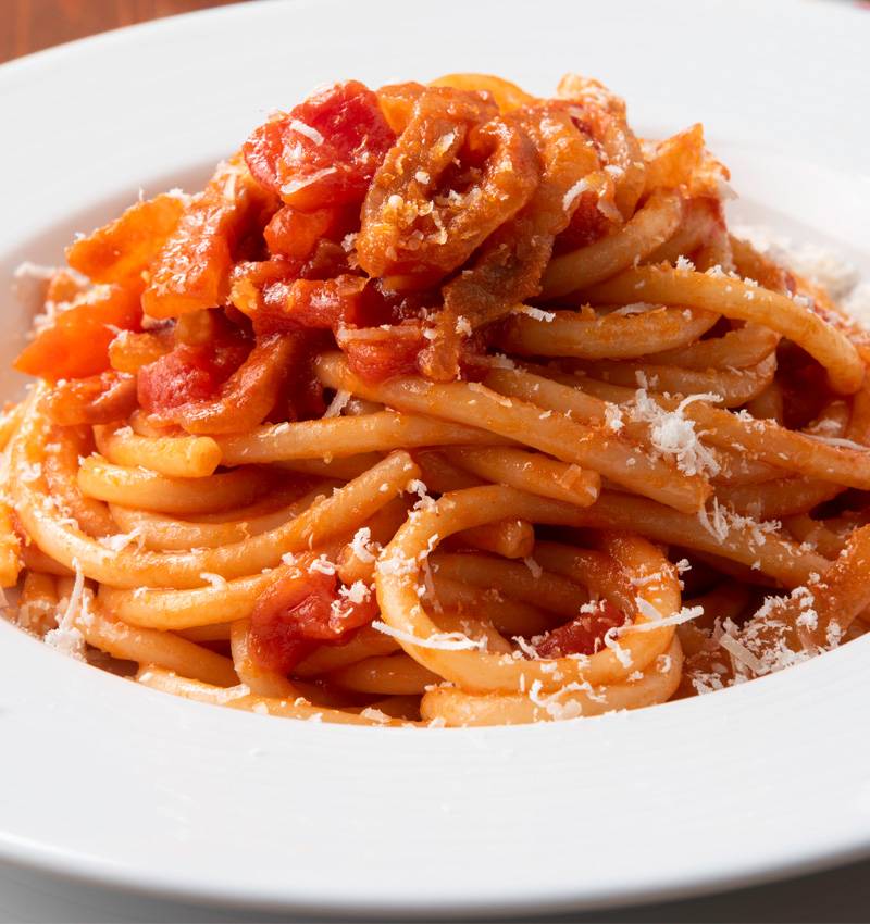 実際にこのソースは、カリッとしたグアンチャーレ、ペコリーノチーズ、トマトソースという至福の組み合わせで、羊飼いと古代の伝統の物語を伝えています。アマトリーチェ発祥のこのレシピは、当初はグリーチャと呼ばれており、地元の羊飼いが主に食していました。スパゲッティやマカロニをオイル、ペコリーノチーズ、コショウ、グアンチャーレで味付けした、トマトを使わないシンプルなレシピです。アメリカ大陸からトマトが渡来したことで、このレシピは今日私たちが知っているアマトリチャーナに変わったのです。いずれにせよ、グリーチャは今でも特にイタリア中部でよく食べられています。