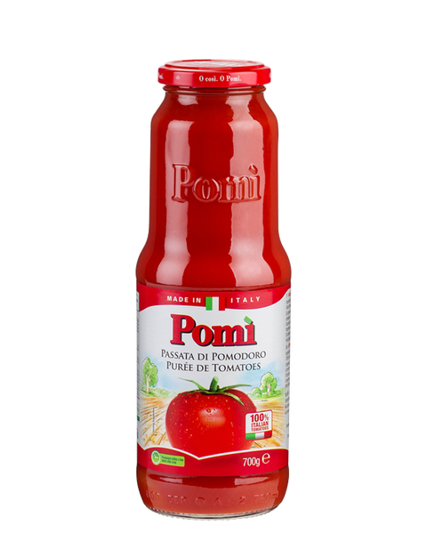 パッサータディポモドーロはイタリアのキッチンの中でも良く使われる材料の一つです。簡単で素早く、そして美味しくて味わい深い色々なレシピをポミは実現させます。パスタは勿論、卵料理やお肉料理まで幅広く貴方の食卓で活躍します。地中海料理の主役、ポミのパッサータディポモドーロは、本物で一度味わえば忘れない程の濃厚さとクリーミーでいて新鮮な薫り、イタリア産100%の厳選されたトマトのみを使って丁寧に作られています。