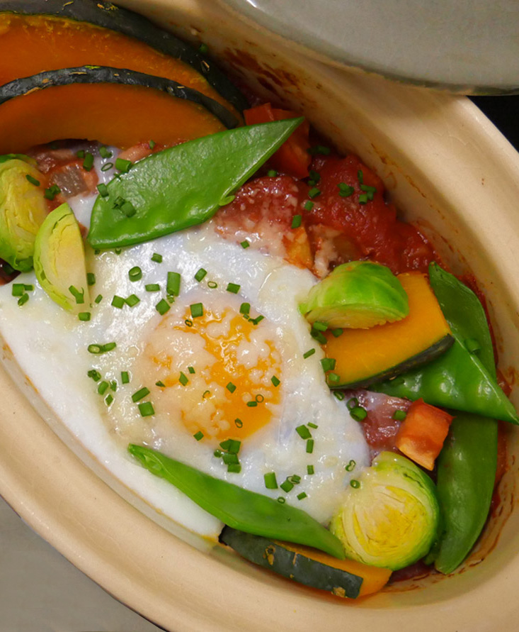 卵、カボチャとミニキャベツのココット 準備時間: 30 min