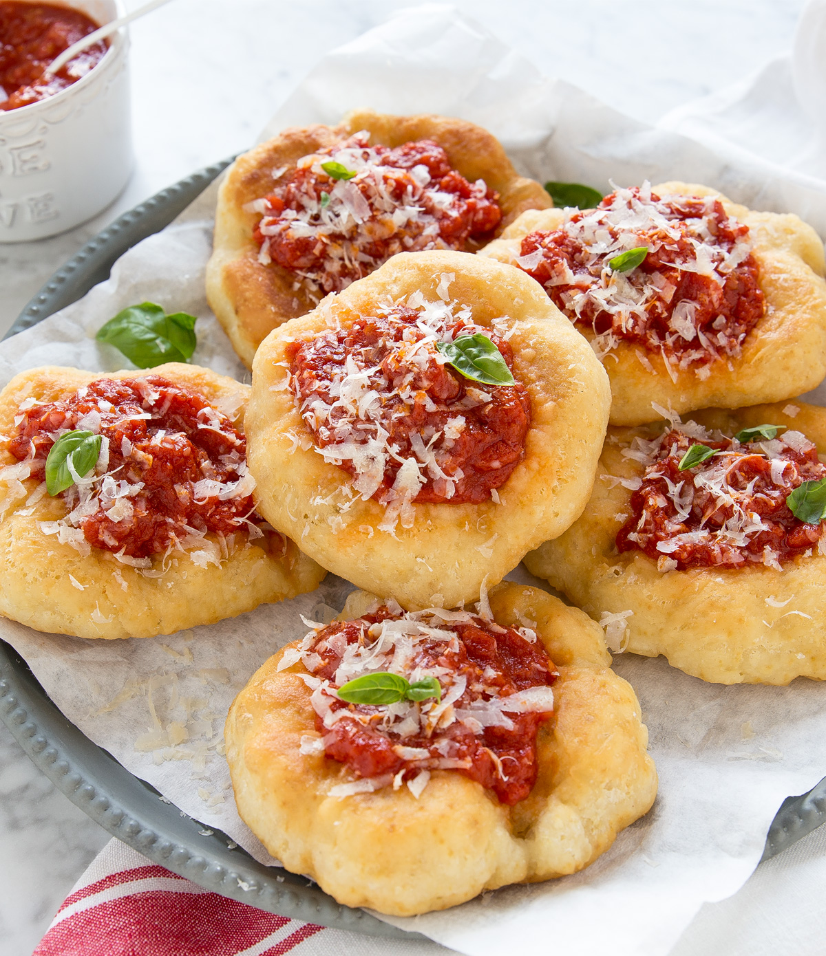 - 直ぐにナポリ風にトマトソース、パルミジャーノチーズとバジルの葉でピッツァを味付けし、熱いうちに召し上がれ。とっても美味しいフライピッツァの出来上がり。