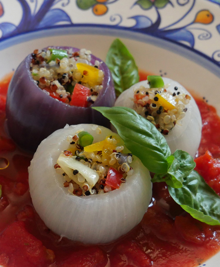 玉葱のキノアサラダ詰め、冷たいバジル風味のトマトスープで 準備時間: 30 min