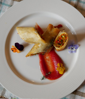 彩り野菜のパリパリロールパプリカとトマトのソース添え