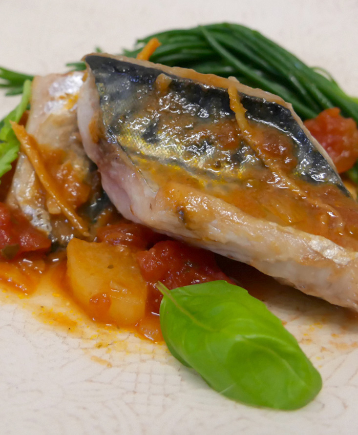 準備まずは鯖の切り身の骨を取り除き、皮目に十字に切り目を入れ、さっと熱湯にくぐらせて臭みをとる。 大根は一口大に切り、軽く下茹でをしておく。 フライパンに、千切りにした生姜と一口大に切った長ネギ、酒と少量の水で火を入れ、鯖と大根、砂糖を加えて蓋をし、醤油とみりんで溶かした味噌を廻し入れ、カットトマト・ガーリックを加えて軽くひと煮立ちさせる。 塩少々で調整をして、バジルの葉を飾って出来上がり。 | For this recipe we used:パッサータディポモドーロ (裏ごしトマト)トマトピューレ 200g |