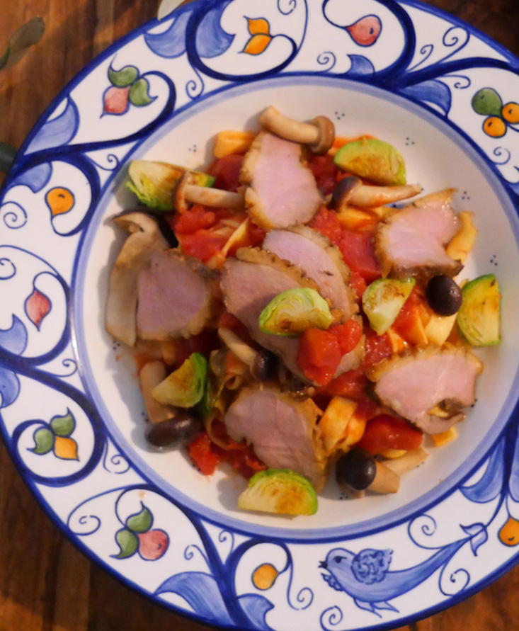 きの子とトマトのソースのフライパンにタリアテッレを加え、良く混ぜ合わせてお皿に盛り付け、薄切りにした鴨胸肉を飾り付けて出来上がり。