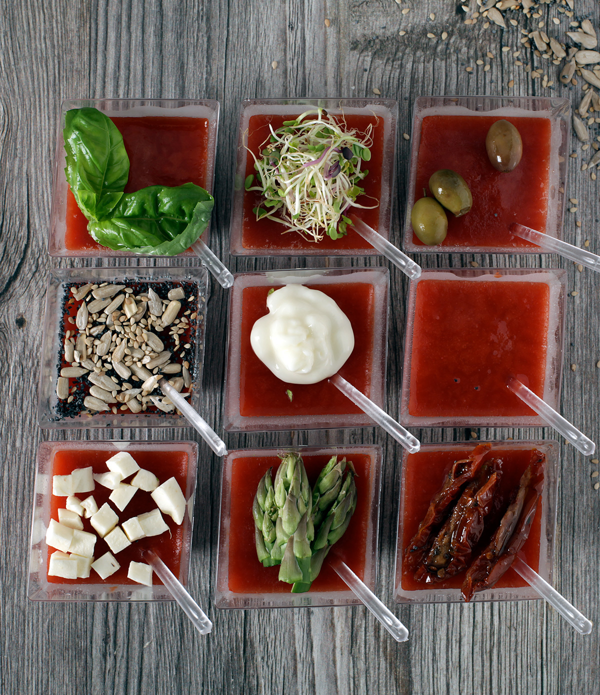 準備このフィンガーフードの作り方には特にルールはありません。お好きな材料を使って作ることが出来ます。ここでは一つの例を紹介します。ガラスなどの小さい入れ物に半分以上のオイル、塩、胡椒で味を付けたパッサータディポモドーロを注ぎます。ひとつひとつお好きな材料、モッツァレラ、フレッシュチーズ、オリーブ、アスパラガスやドライトマトでデコレーションをしてヒマワリの種とゴマを散らして出来上がり。 | For this recipe we used:パッサータディポモドーロ (裏ごしトマト)トマトピューレ 240g |