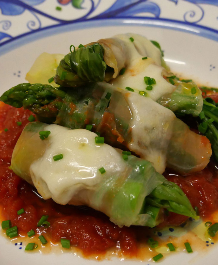 アスパラガスとチンゲン菜の生ハム巻、トマトソース添え 準備時間: 20 min