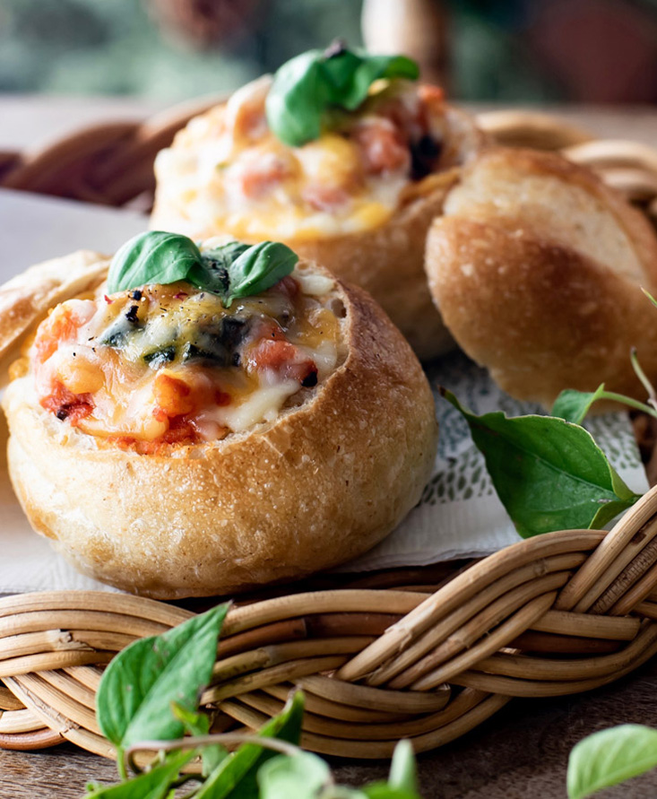 準備①プチフランスの上部をスライスし、カットした断面の円周の内側5ミリくらいに丸くナイフを入 れ、中身のパンをくり抜き、一口サイズにカット。 | For this recipe we used:パッサータディポモドーロ (裏ごしトマト)トマトピューレ 大さじ3 |