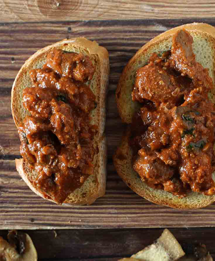 鶏レバーとキノコのクロスティーニ