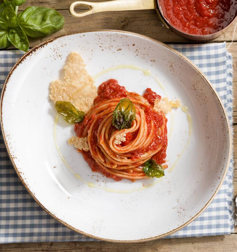 يعد السباكيتي مع صلصة الطماطم رمز الذوق الإيطالي بامتياز. يجسد هذا الطبق الكلاسيكي الخالد جوهر البساطة والمطبخ الإيطالي النموذجي: حيث الطماطم الطازجة والريحان ورذاذ زيت الزيتون. سفير إيطاليا الأصيل في العالم، إنه طبق لا غنى عنه على الإطلاق في القائمة الأسبوعية لكل سكان شبه الجزيرة.
