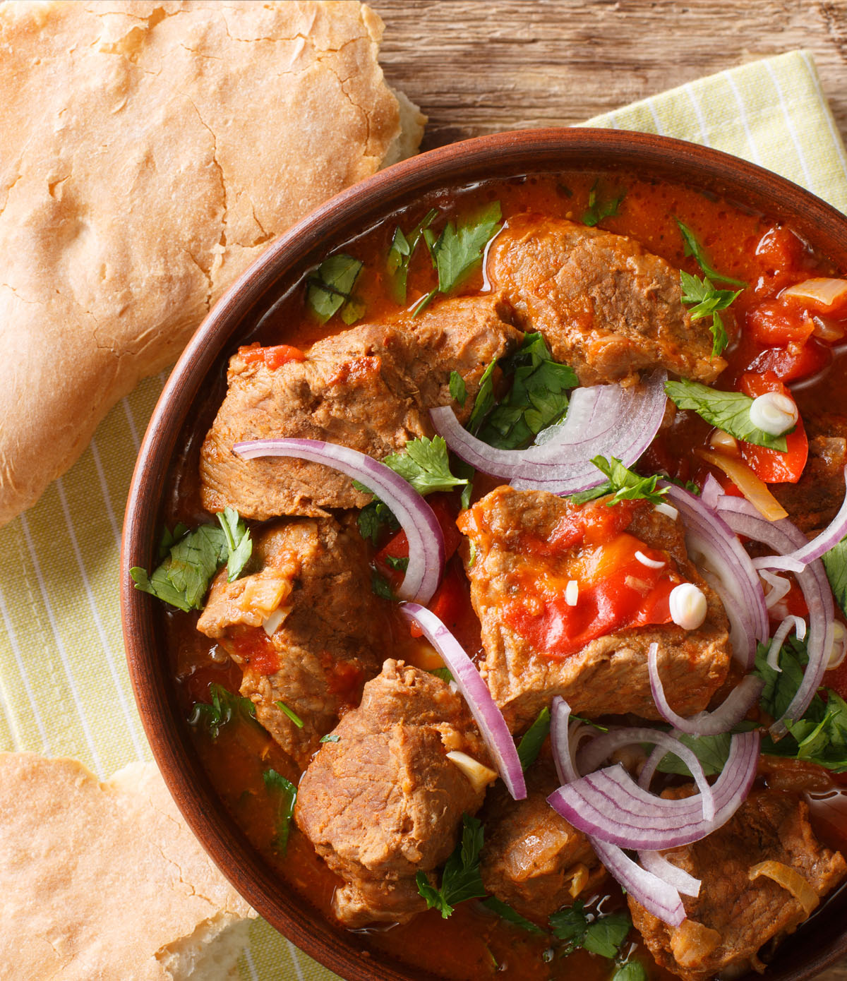 Подготовка - Нарезать телятину небольшими кусочками, лук нарезать полукольцами. Смешать нарезанный лук, мясо и помидоры в миске и оставить мариноваться на 30 минут.