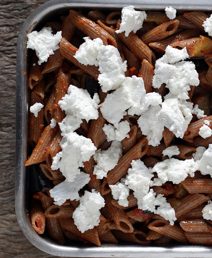 - Выньте форму из духовки и покрошите рикотту (возможно заменить сыром тофу) на пасту.
