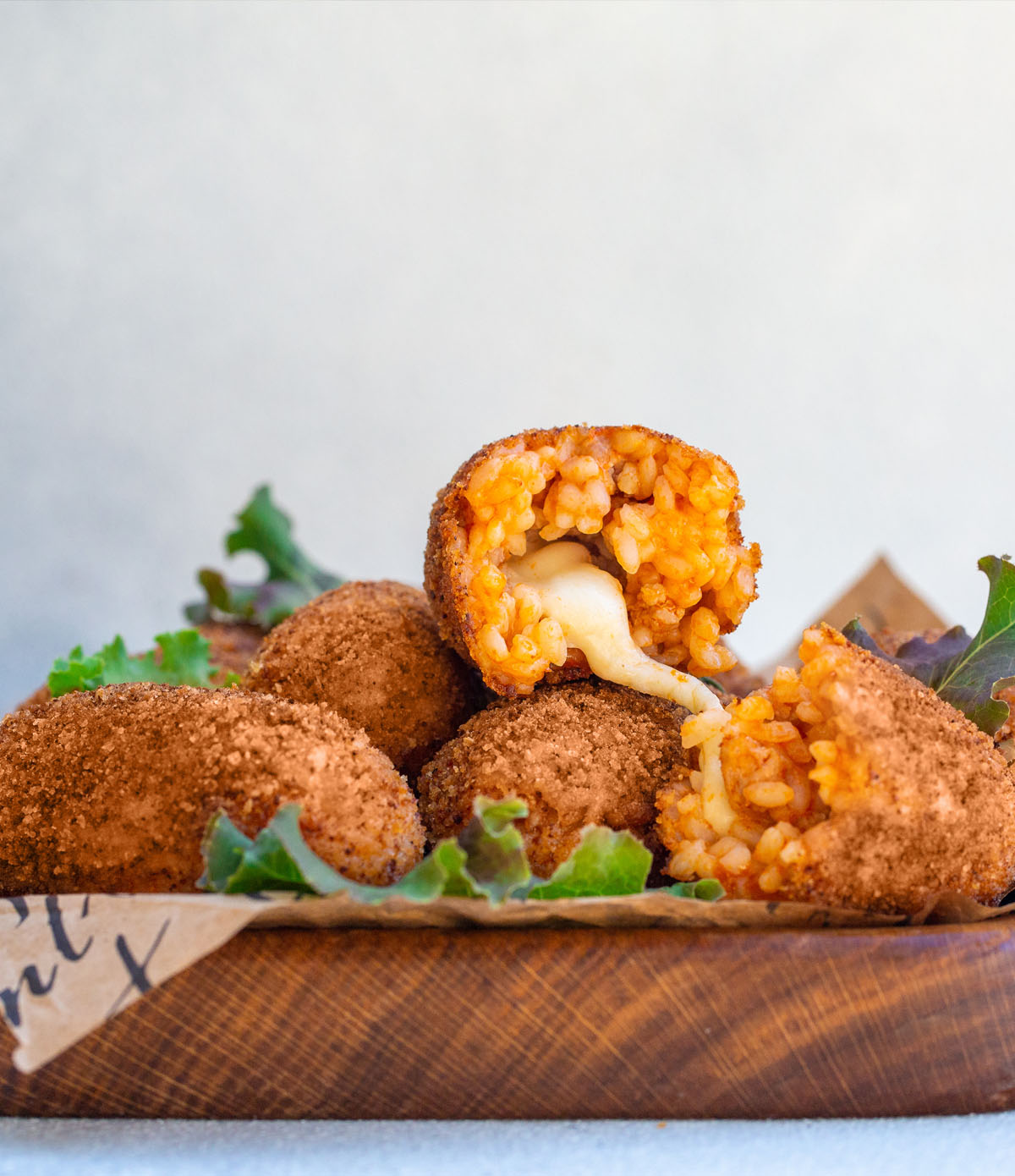 - Возьмите часть риса и приплюсните его, в центр положите кусочек моцареллы и закройте шарик.