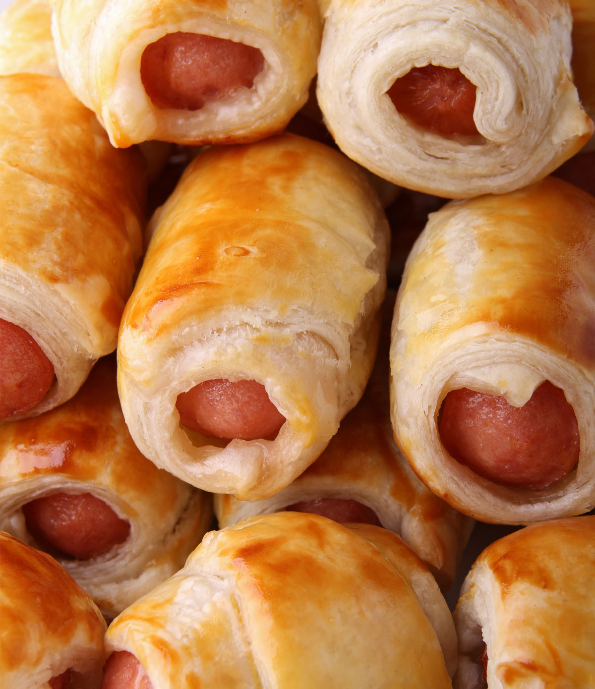 - Выкладываем на каждую полоску теста очищенную сосиску.