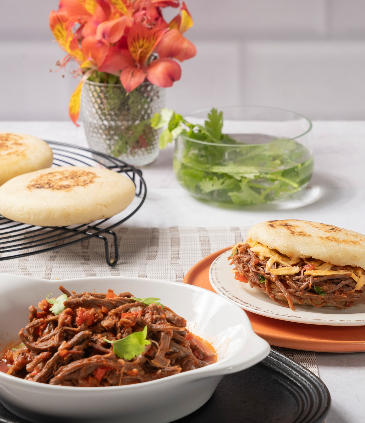 PreparaciónLa carne mechada es versátil y forma parte de nuestra identidad como venezolanos. En esta receta la uso para rellenar nuestras famosas arepas pero también puedes usarla como relleno para empanadas, burritos, tostadas o como parte fundamental de nuestro pabellón criollo: con arroz, caraotas negras y tajadas de plátano macho fritas. Siéntete libre de duplicar las cantidades para usarla en otras preparaciones, puedes guardar la carne sobrante en la nevera por 4 días o congelada hasta por 3 meses (en envases herméticos). Llevar todo a una olla mediana, cubrir con agua, tapar y dejar hervir a fuego medio hasta que la carne ablande. apagar, retirar la carne y reservar hasta que enfríe. Una vez fría separar las hebras con un tenedor. Colar y reservar el caldo sobrante. Calentar el aceite en una sartén y sofreír los aliños (cebolla, ajo, pimentón y ají dulce) hasta que la cebolla transparente, 3 minutos aproximadamente. agregar el comino, y la salsa inglesa. Añadir la passata Pomì y el caldo, revolver y dejar hervir a fuego medio por 20 minutos hasta que reduzca (pero no se seque del todo). Añadir el cilantro, corregir la sal y la pimienta. Reservar. Mezclar los ingredientes, dejar reposar 5 minutos y amasar por 1 minuto. Dividir la masa en 4 porciones iguales, formar pequeñas bolas y aplanar con las manos hasta obtener discos de 10 cm de diámetro. Cocer en un budare o sartén caliente 5 minutos por lado. Abrir las arepas calientes con un cuchillo, rellenar con la carne mechada (y opcionalmente queso amarillo rallado). Consumir de inmediato. | For this recipe we used:Puré de tomate Rústico 1 taza |