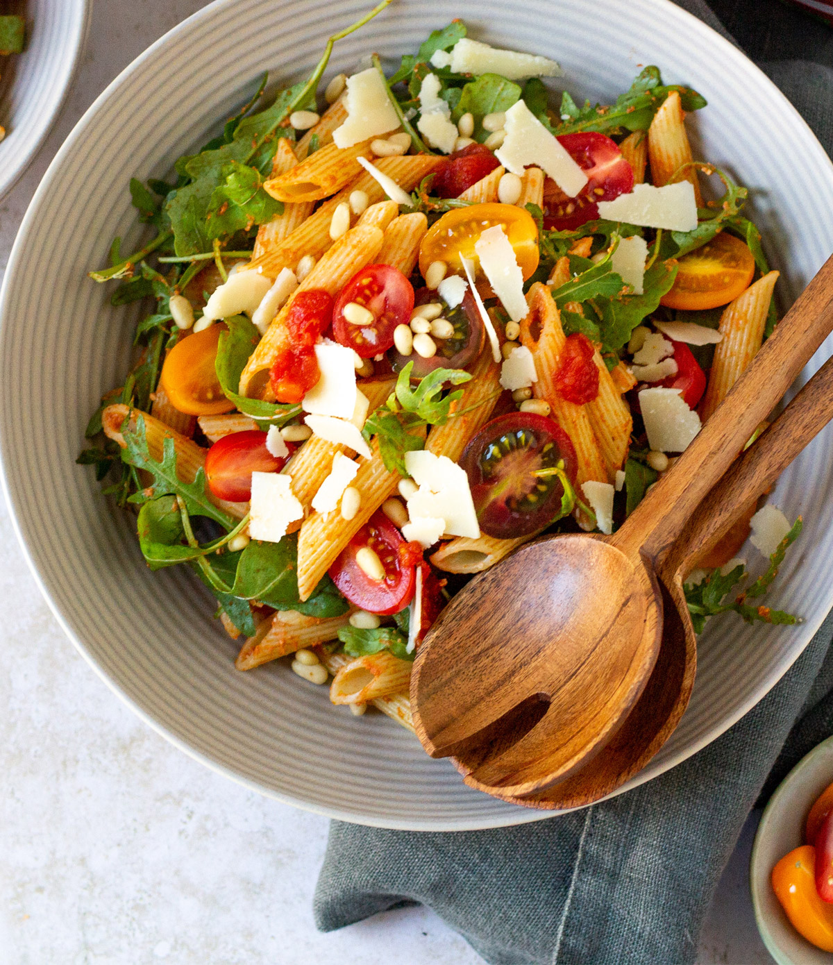 - Añadir rúcula, piñones y tomatitos cherry. Volver a mezclar y aderezar con parmesano recién rallado.