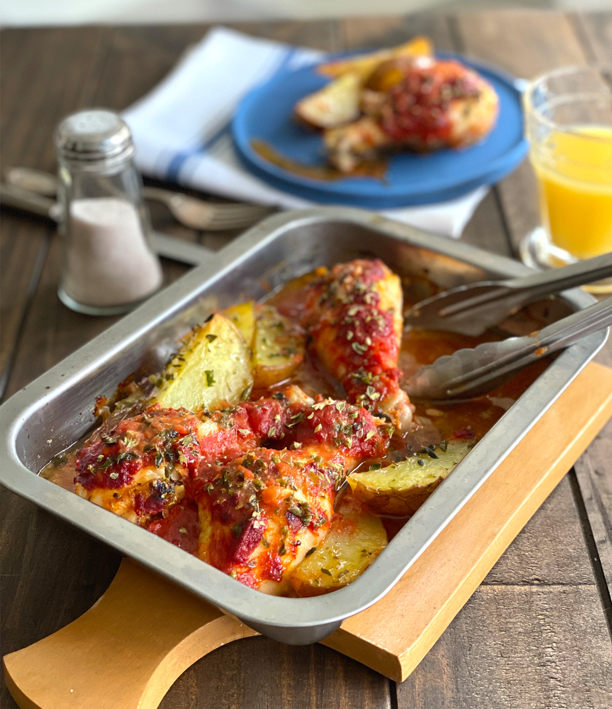 - Llevar al horno por 30 minutos, lo puedes poner para acompañar unas papas cocidas por 8 minutos y después al horno en la misma fuente.