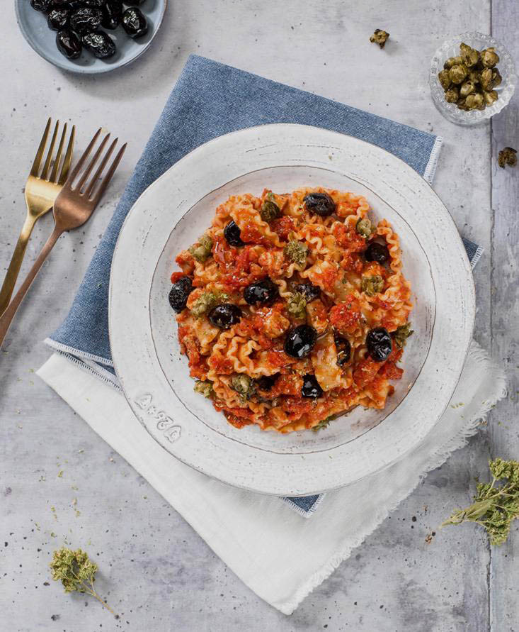 Reginette con ragú de atún fresco, tomate, aceitunas negras y alcaparras fritas Tempo di preparazione: 70 min