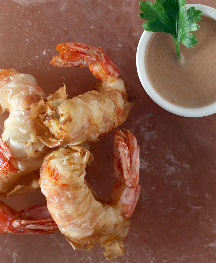 Gambas en pasta filo, con salsa rosa Tempo di preparazione: 25 min